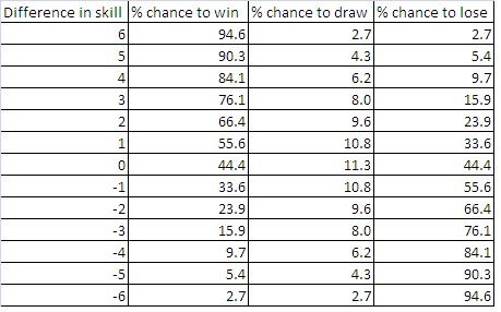 shows the probability of winning, drawing and losing a round depending on the differences in your speed (it says skill because I did it for Fighting Fantasy but the same principles apply.)