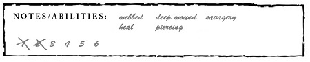 The final part of the sheet is for ‘notes and abilities’. Players will probably use this area in different ways, depending on the combat. For example, you may want to write down and record the abilities you have used, or note down any special abilities that your opponents may have. In some combats, you may need to record the number of combat rounds, so you could use this space to strike off each numbered round once it has been played.